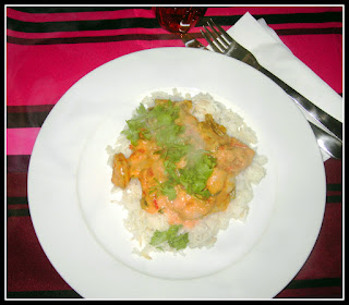 Acrescente o camarão, a malagueta vermelha e misture bem. Deixe cozinhar mais 5 minutos. Adicione um pouco de sumo de lima e os coentros picados.