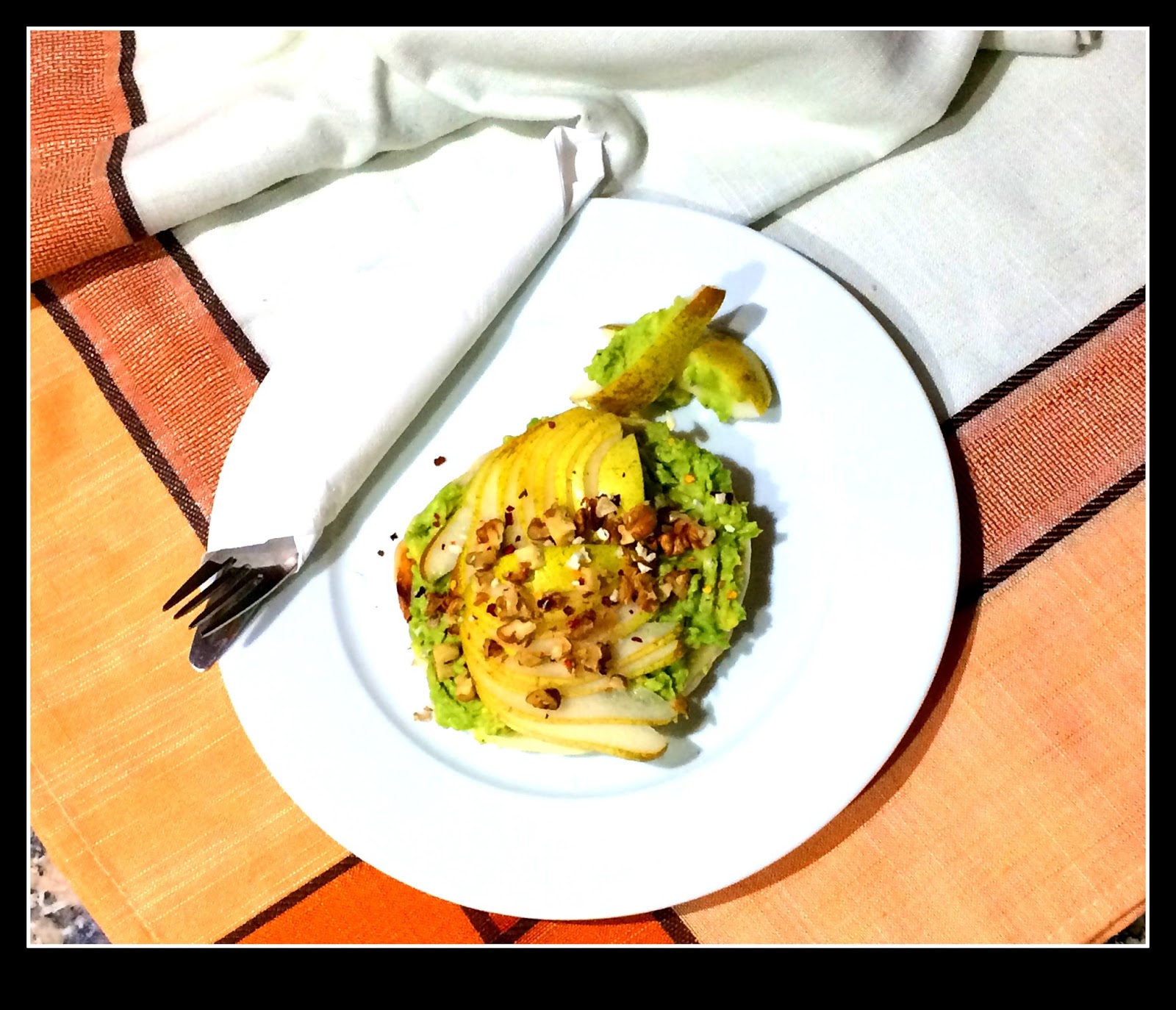 Cut the pear into four pieces and remove the seeds, slice it finely (I have not peeled it, but you can if you want to), put it over the avocado, season with black pepper. Finish with the chopped walnuts.